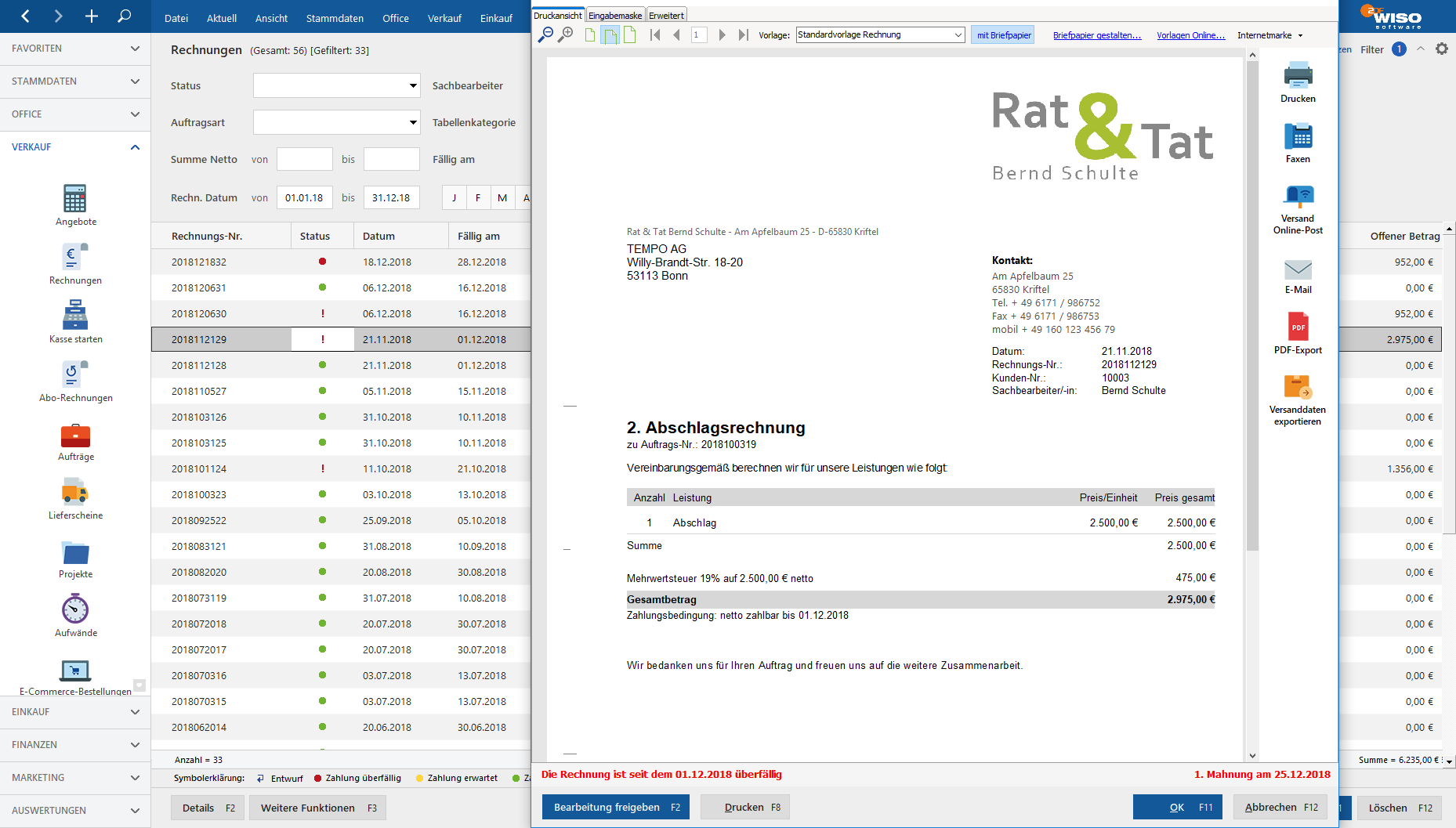 ![]() | Mit dem Modul Verträge behalten Sie Laufzeiten, Fristen und Konditionen für Verträge aller Art im Überblick. Erstellen und berechnen Sie im Handumdrehen z.B. Wartungs-, Service- und andere wiederkehrende Dienstleistungs- und Lieferverträge! | |||