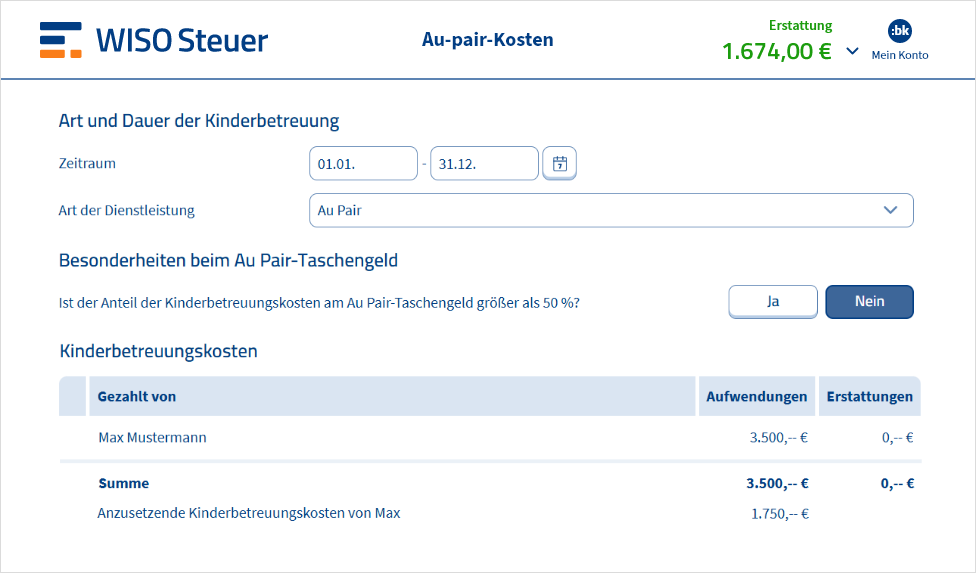 - Keine Angaben im Arbeitsvertrag: Wenn nicht schriftlich vereinbart ist, wie viel Arbeitszeit für jede Aufgabe aufgewendet wird, geht das Finanzamt von einem Verhältnis von 50/50 aus. Du trägst in deiner Steuererklärung also 50 Prozent deiner Au-pair-Kosten als Kinderbetreuungskosten und 50 Prozent als haushaltsnahe Dienstleistung ein.