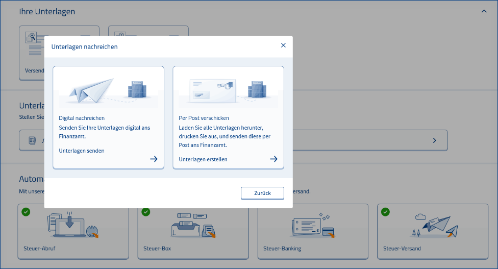 Öffne deine abgesendete Steuererklärung und wähle den Punkt Unterlagen nachreichen aus. Dort lädst du die geforderten Belege hoch und sendest sie sicher an das Finanzamt.