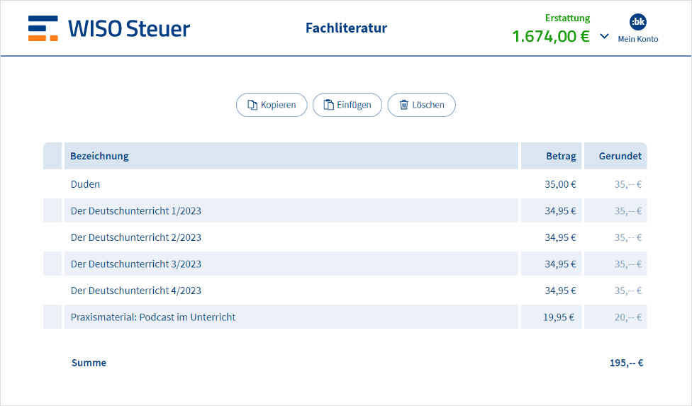 In WISO Steuer gibst du deine Ausgaben einfach unter: Arbeitnehmer, Betriebsrentner und Pensionäre Ausgaben (Werbungskosten) > Sonstiges > Fachliteratur