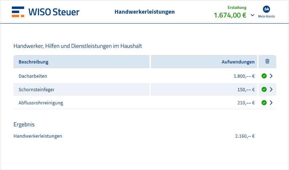 In WISO Steuer trägst du einfach den Gesamtbetrag auf der Rechnung deines Handwerkers ein. Die Berechnung der 20 Prozent übernimmt das Programm automatisch. Und du kannst dabei zusehen, wie deine Erstattung wächst.