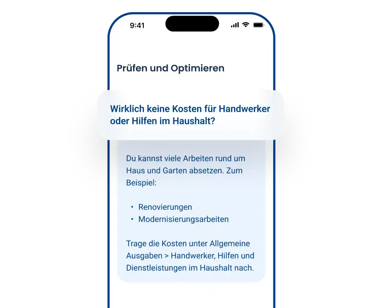 Von Rentenberatung bis Handwerkerrechnung: Du siehst, was du absetzen kannst – und wie sich das sofort auf dein Ergebnis auswirkt.