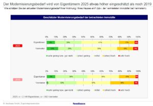 Für eine LBS-Studie zu Fragen der Modernisierung wurden durch das Düsseldorfer Marktforschungsinstitut feedbaxx 2.146 Eigentümer, 302 Vermieter sowie 850 Mieter zu Immobilienzustand und Sanierungsplänen befragt. Die Befragung ergab, dass fast zwei Drittel der Selbstnutzer und Vermieter den Modernisierungsbedarf ihrer Wohnimmobilie als mittel bis sehr hoch einschätzen. Je älter sie werden, desto weniger motiviert sind sie allerdings, anstehende Maßnahmen auch wirklich umzusetzen.